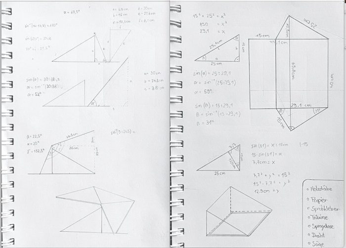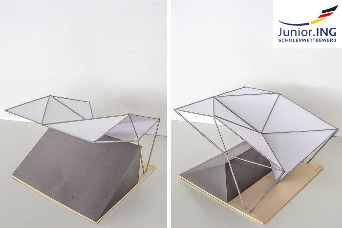 Wir haben uns von der Japanischen Faltkunst Origami inspirieren lassen. Unser Ziel war es so leicht und mit so wenig Material wie nötig etwas sehr stabiles zu bauen. Unsichtbare Drähte haben wir verwendet, um noch zusätzlich Stabilität zu erzeugen.